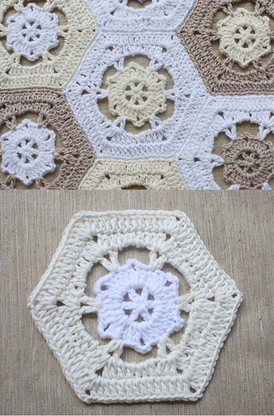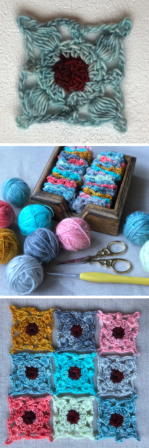 Hitting the exact gauge is not critical, you’re aiming for something that’s about 18sts & 10 rows in granny stitch over 10cm / 4”.