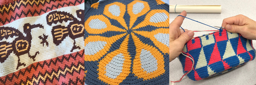 Probably one of my favourite techniques to date… we used tapestry crochet to make round based, colourful bags. We covered basic colour-work techniques, working in the round. After mastering these techniques with a small set project, students were then able to make their own bags, either from patterns or by coming up with their own designs. We covered how to read colour-charts, especially circular charts where the increases are not marked.